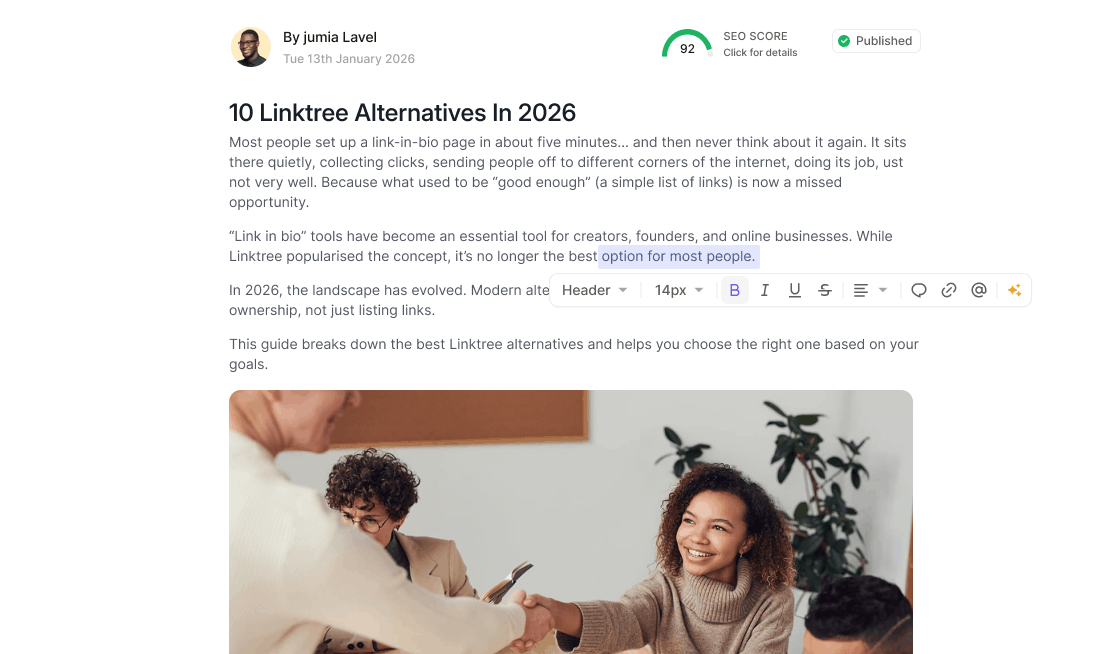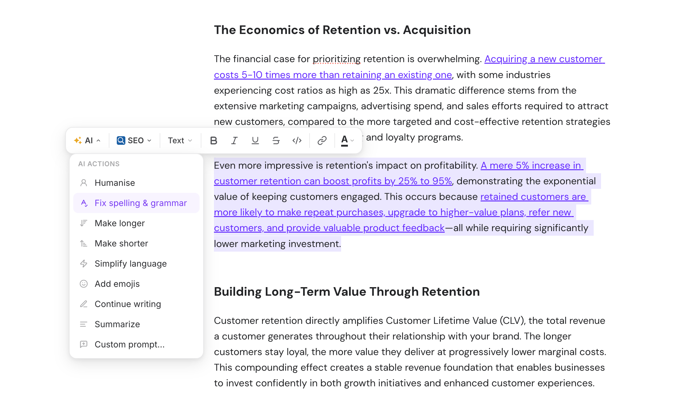 Sometimes the AI gets it 90% right and you want to close the gap. The built-in editor lets you go in and shape any article yourself. Inline AI suggestions mean you're never staring at a blank paragraph. Tweak a sentence, rewrite a section, or just hit publish. Your call.