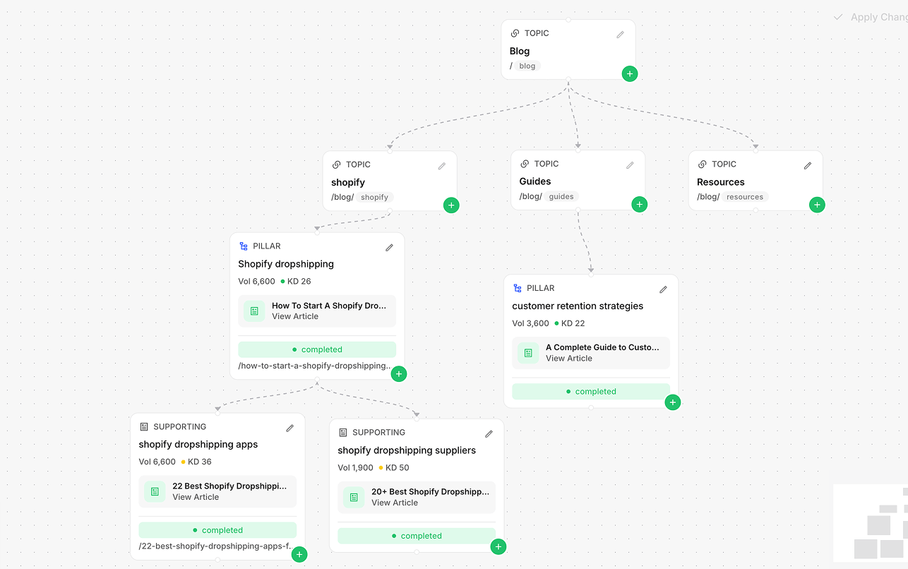 Seio gives you a starting point, not a straitjacket. The content map lets you see how your topics connect, spot gaps in your coverage, and build out the areas you actually want to own. Autopilot when you want it. Full control when you don't.
