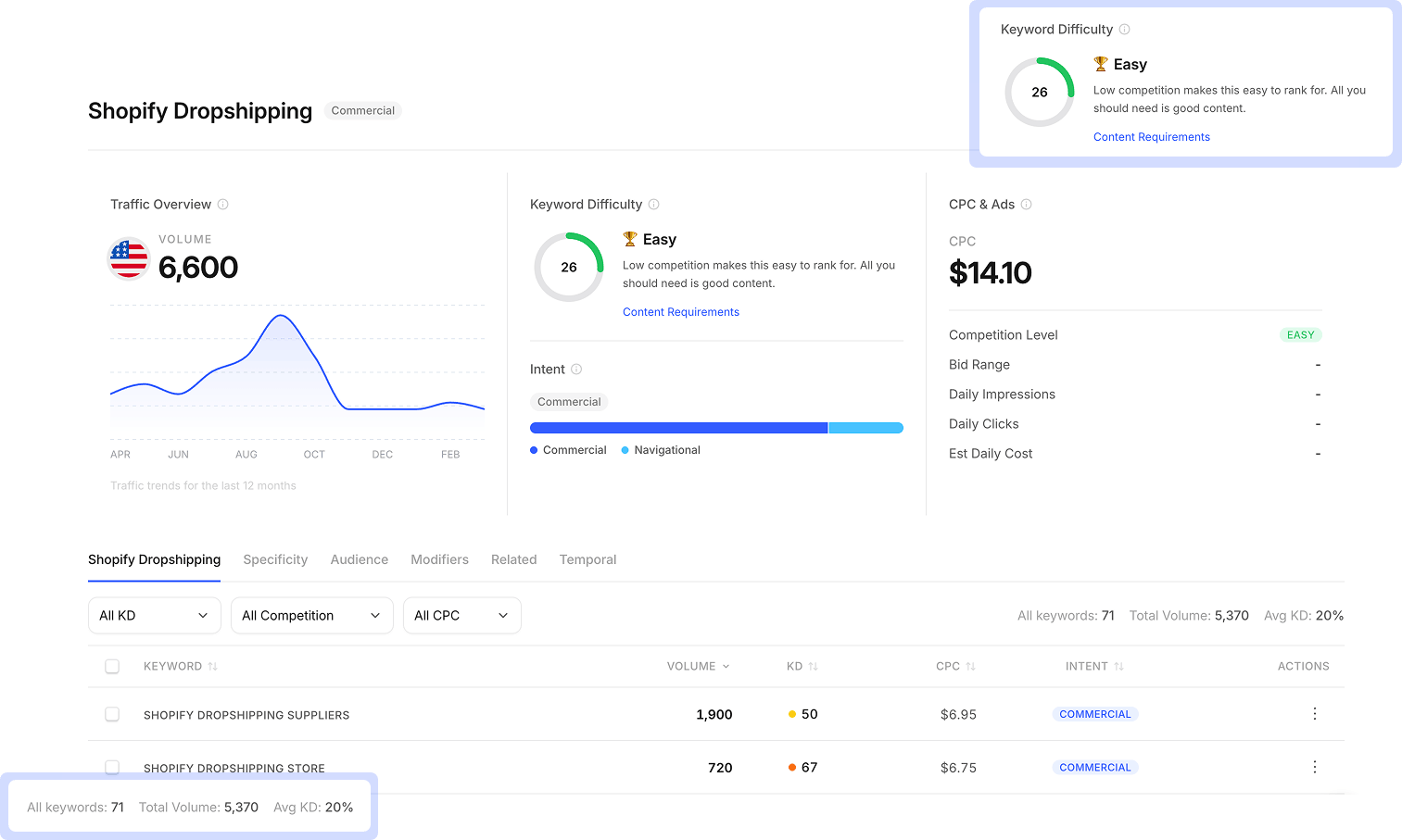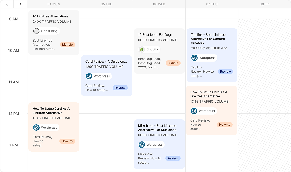 Seio builds a data-driven content calendar, each day targeting a keyword with the highest ranking potential for your site.